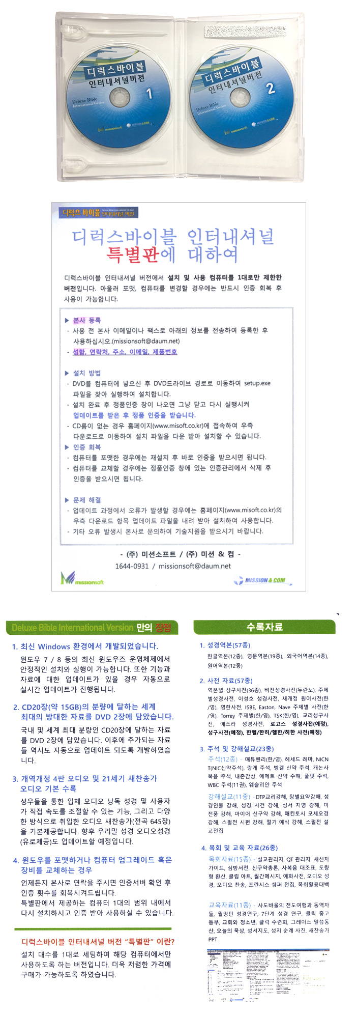 디럭스바이블 인터내셔널 버전 "특별판" 이란? 설치 대수를 1대로 세팅하여 해당 컴퓨터에서만 사용하도록 하는 버전입니다. 더욱 저렴한 가격에 구매가 가능하도록 하였습니다.