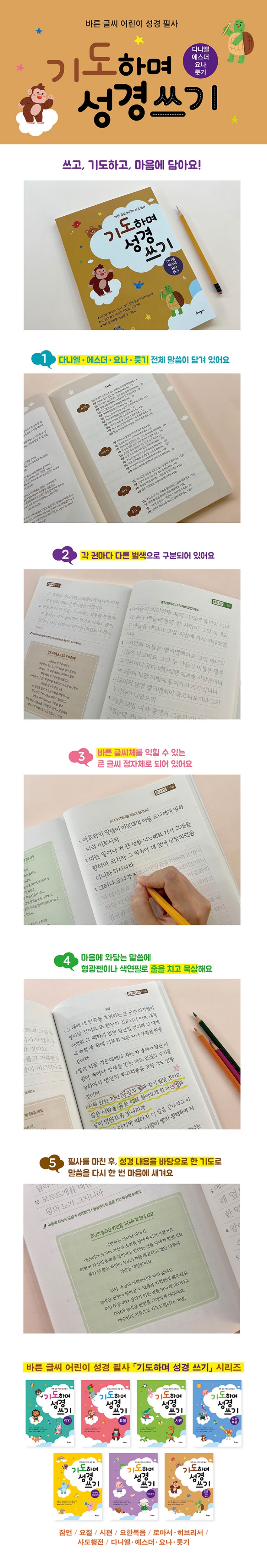 특별히 「기도하며 성경 쓰기」 시리즈는 자신이 손으로 쓴 말씀 내용으로 기도할 수 있도록 구성되어 있습니다. 다니엘·에스더·요나·룻기 말씀을 한 글자 한 글자 천천히 쓰면서 마음에 새기고 그 말씀으로 잠잠히 기도해 보십시오. 하나님께서 어떻게 놀라운 역사를 이루어 가시는지 배우게 될 것입니다.