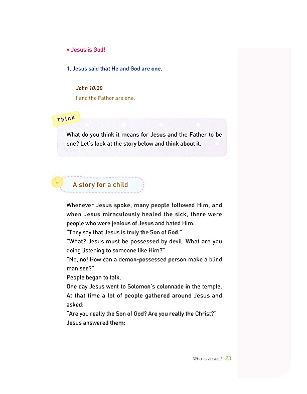 공부로 그치지 않도록 아이에게 질문을 하여 생각을 듣고 성경에서 답을 찾는 방식으로 많은 대화를 할 수 있도록 이끈다. 각 과 말미에 해당 주제에