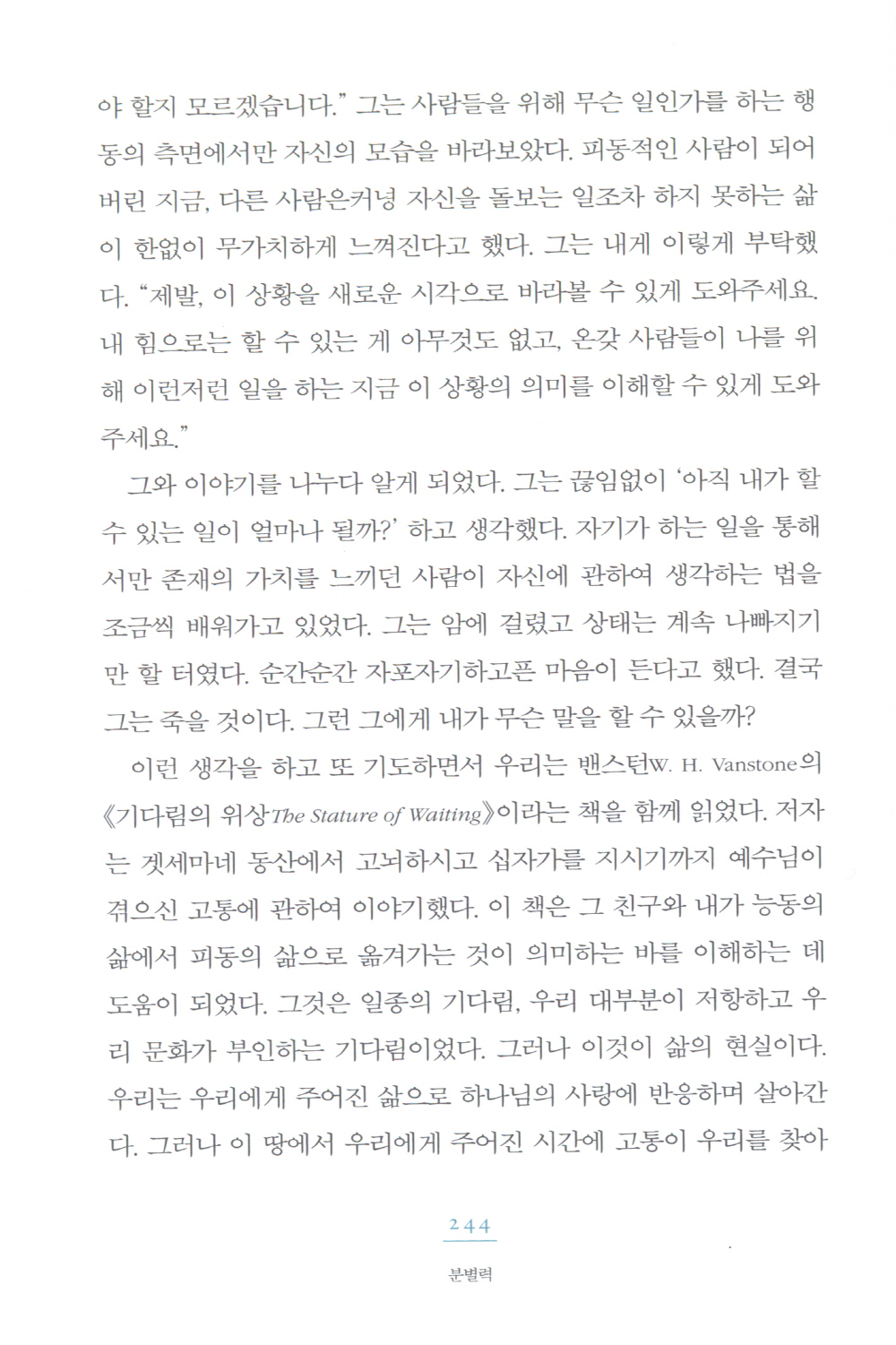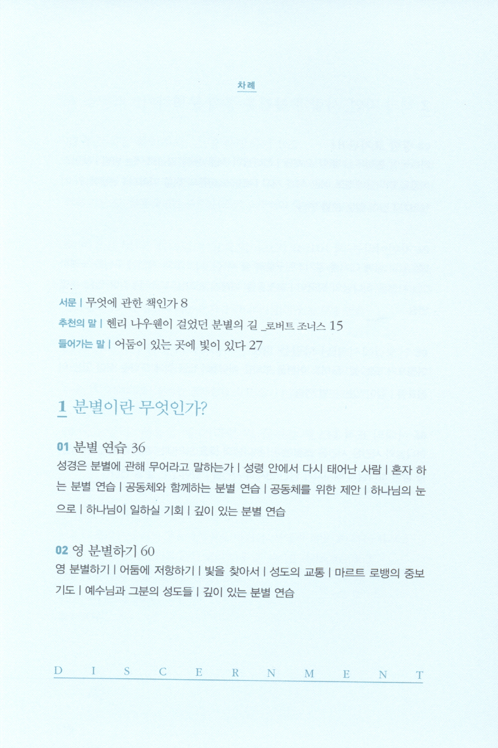 어떤 시구(詩句)나 성경 구절이 특별한 방식으로 우리에게 말을 걸 때, 자연이 노래하고 피조세계가 그 영광을 드러낼 때, 인생길에서 특정한 사람을 만난 것이 특별한 의미가 있는 것 같을 때, 중대한 사건이나 시사 문제가 의미심장하게 다가올 때가 있다. 그때는 그것들이 가리키는 하나님의 뜻에 주목해야 한다. 분별은 그러한 표징을 읽고 하나님의 메시지를 알아채는 것이다. 헨리 나우웬은 그리스도인들이 오래 전부터 걸어온 이 분별의 길로 우리를 인도할 믿을 만한 안내자다._ p.8-9 중에서
