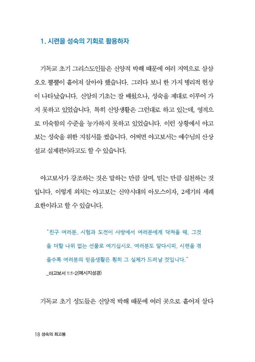 이 책의 저자인 조봉희 목사는 ‘성숙의 최고봉’을 통해 믿음의 실천성을 강조한다. 나이는 어른인데 행동은 어린아이 수준에 머물러 있는 영적인 성인아이 수준으로 머물러서는 안 된다. 저자는 믿음, 기도, 마음가짐 등 종교적 신앙생활의 단계를 넘어서는 생활 신앙을 말한다. 각 챕터는 야고보서의 말씀으로 실천을 통한 생활 신앙이 성숙함에 이르도록 실천 지침을 제시한다. 이것은 야고보의 가르침만이 아니라 바로 예수님의 가르침이기도 하다.
