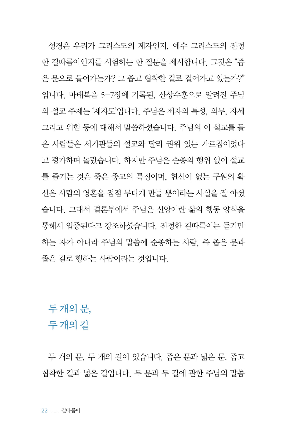 책은 1부 ‘길따름이의 질문’과 2부 ‘길따름이의 대답’으로 예수 그리스도를 따라 배우는 길의 열두 번의 이정표를 안내한다. 언젠가 우리도 그렇게 물은 적 있는 것 같은 질문들은 비로소 새로운 대답으로 이끈다. 좋은 책은 이런 일을 한다. 참된 그리스도인이 아닌 ‘거의 그리스도인’들, 공동체에 속하지 않으며 ‘하나 됨’은 그저 말뿐이지 그렇게 사는 건 불가능하다고 여기던 사람들, 자기 판단과 자기 주관과 자기 계획만을 따르던 사람들을 바꾼다. 새 길을 따르도록 북돋운다.