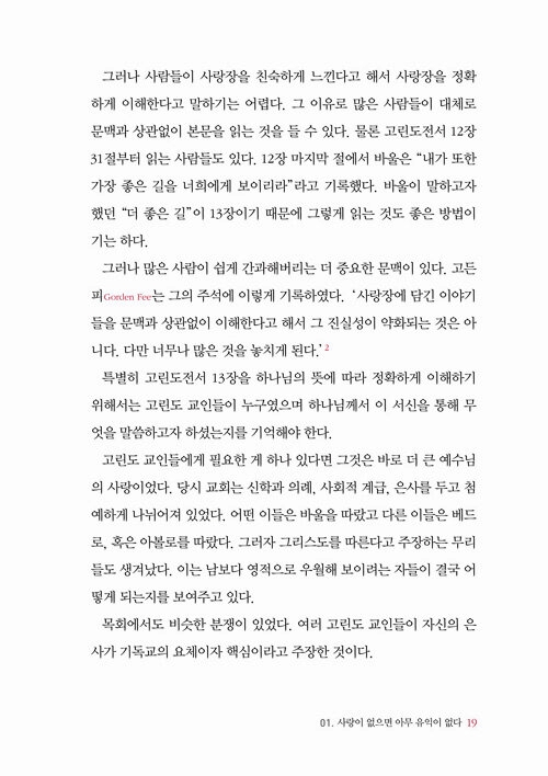 소위 ‘사랑장’이라 불리는 고린도전서 13장은 사람들에게 가장 친근한 성경 본문 중 하나다. 그래서 많은 크리스천이 그 말씀을 읽고 외우고 노래한다. 하지만 “사랑은 오래 참고 사랑은 온유하며 시기하지 아니하며 사랑은 자랑하지 아니하며 교만하지 아니하며······” 와 같은 사랑의 이 모든 속성을 온전히 이해하는 사람이 몇이나 될까? 많은 사람이 사랑을 말하고 사랑을 생각하지만 그것에 대한 구체적인 그림은 갖고 있지 않다. 그저 좋은 것, 아름다운 것이라는 막연한 동경 속에서 서로를 위로하는 데 사용할 뿐이다. 그러나 이와 같은 사람들의 오해와 달리 사도바울은 고린도전서 13장을 통해 자기중심적인 생각으로 가득한 고린도 교인들에게 더 나은 삶을 살 것을 권면하며 사랑의 중요성과 구체적인 방법들을 제시했다. 즉 사랑장은 막연하고 추상적인 감성으로 사람들의 마음을 위로하는 것이 아니라 하나님을 이해하고, 예배하고, 섬기고, 헌신하는 데 있어서 자신의 방법만이 최고라 믿는, 사랑 없는 자들을 향한 도전의 말씀이다.