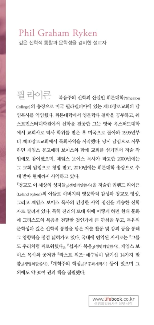 이처럼 성경적이면서도 새로운 관점으로 참된 사랑을 분석한 필 라이큰에게 감사하게 될 것이다. 이 책은 단순하면서도 깊이 있는 내용으로 사랑에 대한 당신의 생각을 변화시키고 새로운 시각으로 참된 사랑을 이해하도록 도울 것이다.