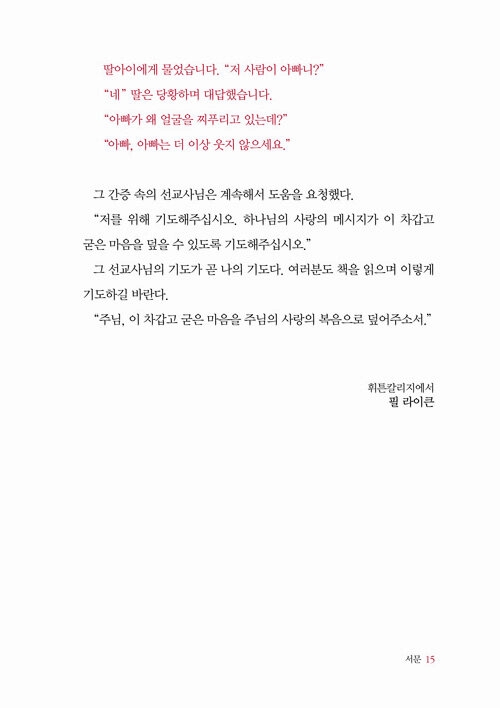 나는 그분이 먼저 나를 사랑하셨고 그 사랑의 핵심이 내가 다른 사람들을 사랑하는 작은 능력이 된다는 것을 알고 있다. 깊이 있는 이 책을 통해 그것을 늘 기억하도록 도와준 필 라이큰에게 두고두고 감사하게 될 것 같다.