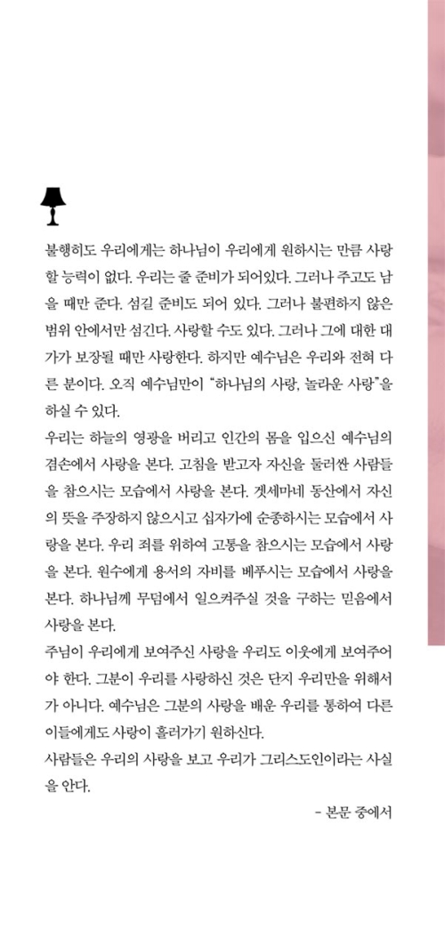<사랑한다면 예수님처럼>은 나에게 가장 큰 도전을 준 책이다. 예수님의 사랑 안에서 성장하기 원하는 사람들에게 꼭 권하고 싶다.