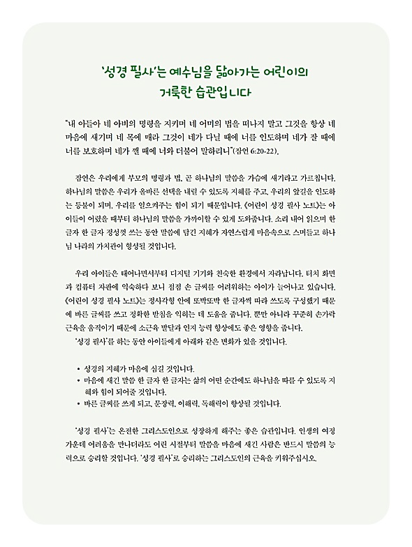 우리 아이들은 태어나면서부터 디지털 기기와 친숙한 환경에서 자라납니다. 터치 화면과 컴퓨터 자판에 익숙하다 보니 점점 손 글씨를 어려워하는 아이가 늘어나고 있습니다. 《어린이 성경 필사 노트》는 정사각형 안에 또박또박 한 글자씩 따라 쓰도록 구성했기 때문에 바른 글씨를 쓰고 정확한 받침을 익히는 데 도움을 줍니다. 뿐만 아니라 꾸준히 손가락 근육을 움직이기 때문에 소근육 발달과 인지 능력 향상에도 좋은 영향을 줍니다. 또한 《어린이 성경 필사 노트》는 아이들이 어렸을 때부터 하나님의 말씀을 가까이할 수 있게 도와줍니다. 소리 내어 읽으며 한 글자 한 글자 정성껏 쓰는 동안 말씀에 담긴 지혜가 자연스럽게 마음속으로 스며들고 하나님 나라의 가치관이 형성될 것입니다.