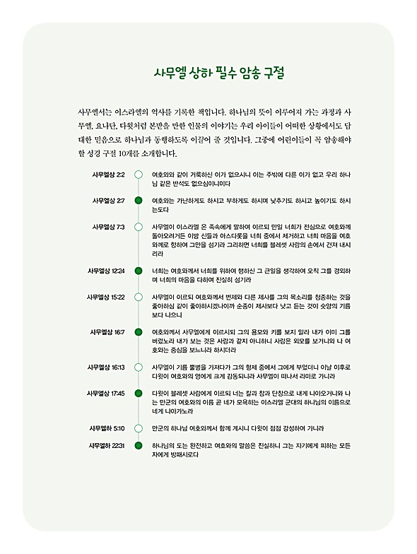 사무엘서는 이스라엘의 역사를 기록한 책입니다. 하나님의 뜻이 이루어져 가는 과정과 사무엘, 요나단, 다윗처럼 본받을 만한 인물의 이야기는 우리 아이들이 어떠한 상황에서도 담대한 믿음으로 하나님과 동행하도록 이끌어 줄 것입니다.