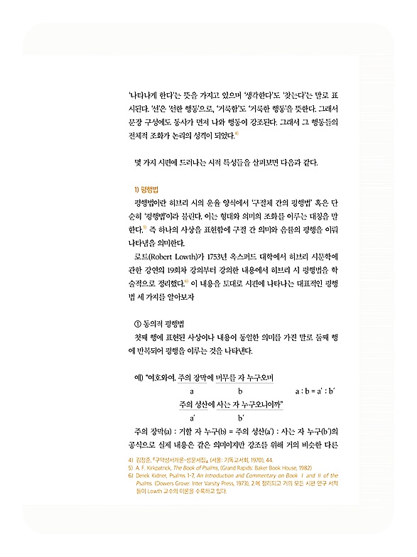 시편은 오늘 여기에서 다시 경험할 수 있는 종교적인 경험을 기록한 문헌으로서 특이점을 가진다. 이스라엘의 넋이 배후에 있는 시편의 내용은 오늘을 사는 기독교인들에게 깊은 감명을 주고 시인들의 생각을 따라 생각하고, 그들의 신앙을 본받고, 그들의 환상을 같이 볼 수 있다. 즉 앞서 말한 바와 같이 감정이입 하면서 읽을 수 있는 성경이다. (11p)