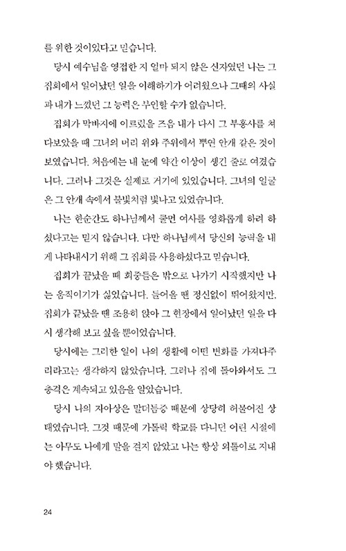 다시 주님께서 분명히 말씀하셨습니다. 「네가 복음을 전파하지 않는다면, 저 속에 떨어지는 사람 모두가 다 너의 책임이 될 것이다.」 나는 그제야 내 삶 속에 일어났던 모든 것이 복음을 전파할 한 가지 목적 때문이었음을 알았습니다.
