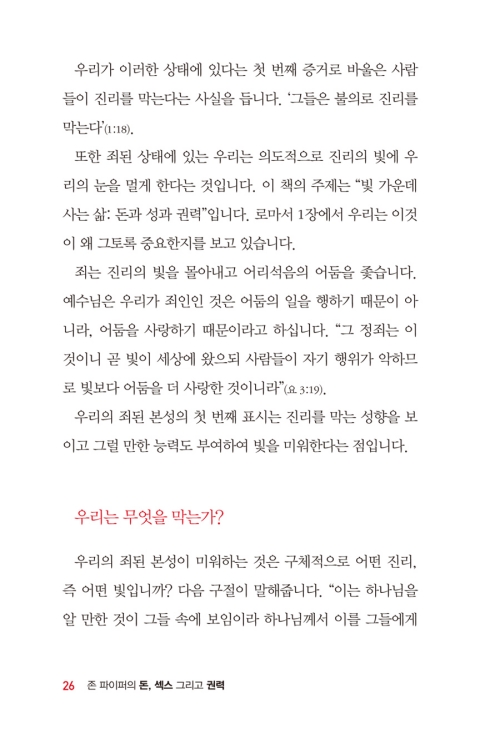 요한은 육신의 정욕과 안목의 정욕, 이생의 자랑을 세속성의 본질로 보았습니다. 그 현대적 표현이 바로 돈과 성과 권력입니다. 리처드 포스터의 고전, <돈과 성과 권력> 이후 이 중요한 이슈가 존 파이퍼에 의해 다루어진 것이 다행스럽습니다. 파이퍼는 좀 더 신학적이고 성경적으로 보완된 안목으로 오늘을 사는 그리스도인들에게 균형 있고 통찰력 있는 삶의 빛을 제공합니다. 이 빛 안에서 다시 일어서는 오늘의 성도, 오늘의 교회를 보고 싶습니다.