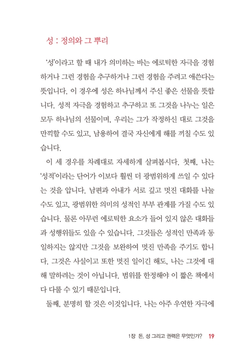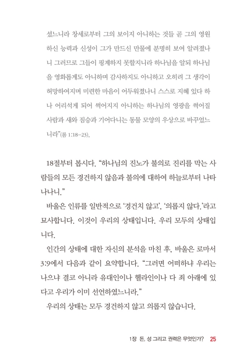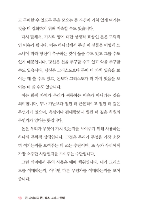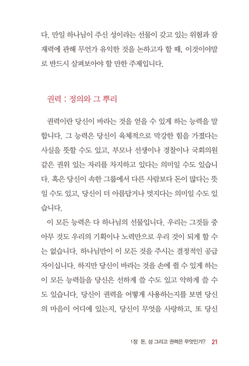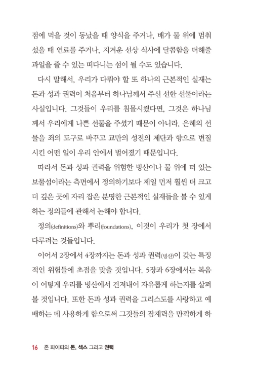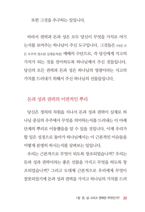 2. 이 책은 오늘날 모든 그리스도인들이 공통적으로 직면하고 있는 <돈과 성과 권력>의 문제들을 매우 실용적이고 성경적으로 깊게 다루었다. 저자는 이 책을 통해 매우 짧고 간결하고 예리하게 <돈과 성과 권력>의 실체를 보여준다.