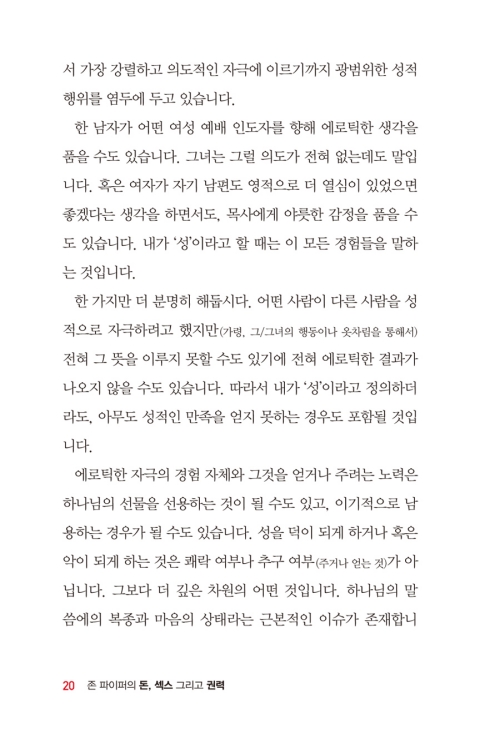 하지만 <돈과 섹스와 권력>은 하나님의 선물로서, 선을 위하여 사용할 수 있고 악을 위해서 사용할 수 있는 도구적 가치일 뿐이다. 이 점에 있어서 존 파이퍼는 <돈과 섹스와 권력>이 인간에게 세 가지 중요한 기회이자 동시에 위험한 자리라고 설명한다.