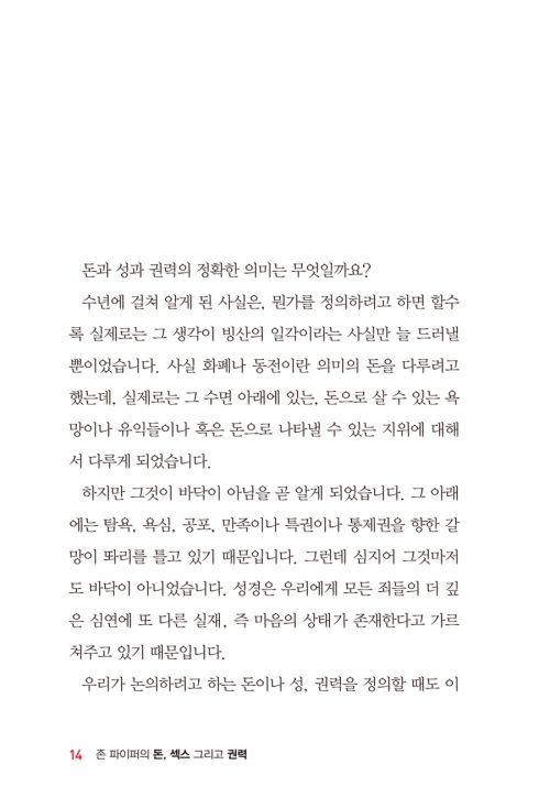 본서는 인간의 내면 근원에 자리 잡고 있는 ‘돈과 섹스와 권력’의 문제를 심도 있게 다루고 있다. 특히 미국의 대표적인 설교자 중의 한 사람인 존 파이퍼의 날카로운 통찰을 담고 있다. 존 파이퍼는 이 책에서 <돈과 섹스와 권력>의 문제를 단순히 ‘How’의 관점뿐만 아니라 이 문제에 자리 잡고 있는 인간의 근본문제를 포괄적으로 접근한다.