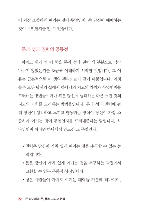 1. 이 책의 통찰력과 분석은 놀랍다. <돈과 성과 권력>은 심각한 위험성을 가지고 있지만, 하나님의 영광이 중심에 있을 때, <돈과 성과 권력>은 그리스도의 이름을 위한 놀라운 도구가 될 수 있다는 점을 존 파이퍼 특유의 필체로 설득력있게 설명하고 있다.