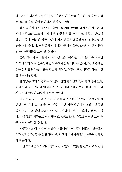 지금쯤이면 내가 왜 석조 건축과 클래딩 이야기를 꺼냈는지 짐작했으리라 생각한다. 답은 간단하다. 현대 교회의 제자훈련이 대부분 클래딩과 비슷하다.