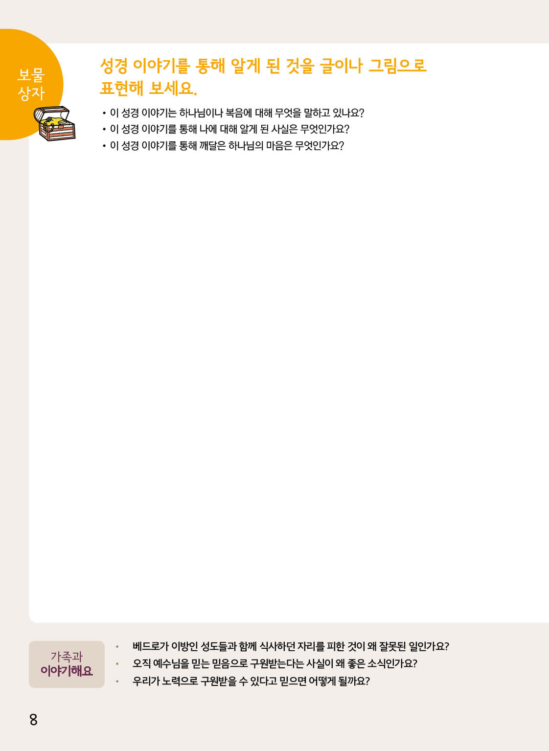 단편적 성경 학습이 아닌 삶으로 체화되도록 매 과를 마무리하는 나만의 기록장에서 묵상한 내용을 표현하는 훈련을 합니다.