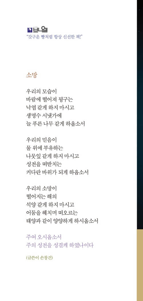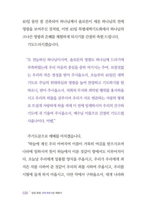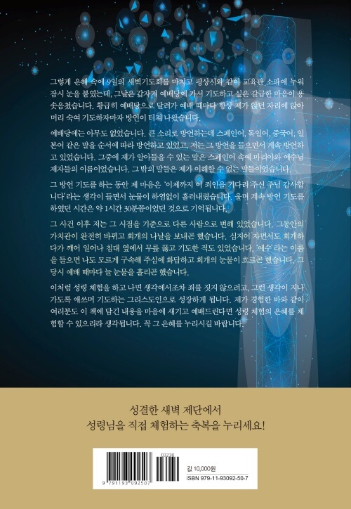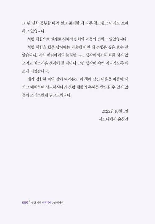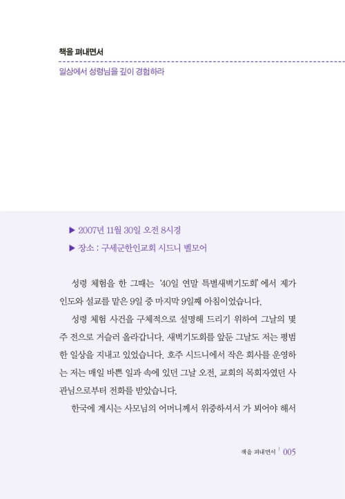 이처럼 성령 체험을 하고 나면 생각에서조차 죄를 짓지 않으려고, 그런 생각이 지나가도록 애쓰며 기도하는 그리스도인으로 성장하게 됩니다. 제가 경험한 바와 같이 여러분도 이 책에 담긴 내용을 마음에 새기고 예배드린다면 성령 체험의 은혜를 체험할 수 있으니라 생각됩니다. 꼭 그 은혜를 누리시길 바랍니다.
