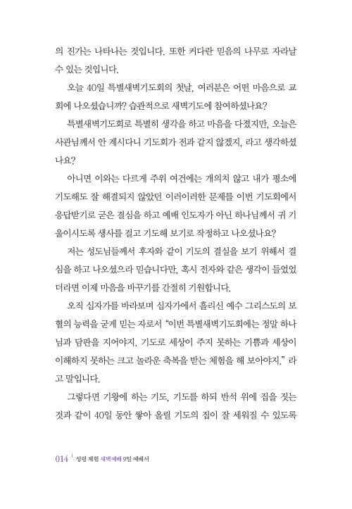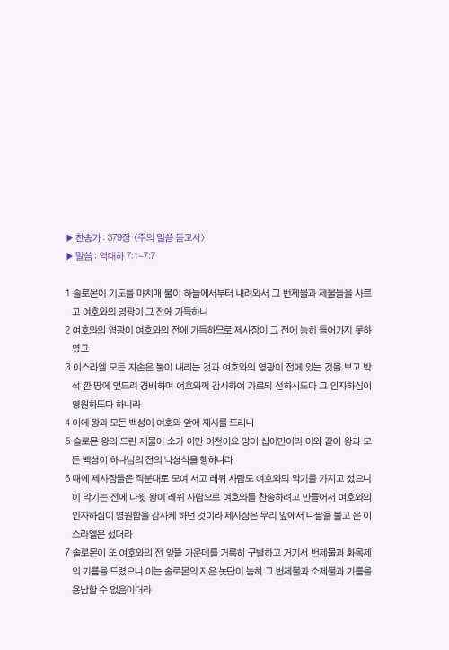 오늘 40일 특별새벽기도회의 첫날, 여러분은 어떤 마음으로 교회에 나오셨습니까? 습관적으로 새벽기도에 참여하셨나요? 특별새벽기도회로 특별히 생각하고 마음을 다졌지만, 오늘은 사관님께서 안 계시다니 기도회가 전과 같지 않겠지, 라고 생각하셨나요? 아니면 이와는 다르게 주위 여건에는 개의치 않고 내가 평소에 기도해도 잘 해결되지 않았던 이러이러한 문제를 이번 기도회에서 응답받기로 굳은 결심을 하고 예배 인도자가 아닌 하나님께서 귀 기울이시도록 생사를 걸고 기도해 보기로 작정하고 나오셨나요? …그렇다면 기왕에 하는 기도, 기도하되 반석 위에 집을 짓는 것과 같이 40일 동안 쌓아 올릴 기도의 집이 잘 세워질 수 있도록 오늘 이 아침, 튼튼하고 변하지 않는 40일간 생사를 걸고 기도하리라는 결단이라는 반석, 구하면 줄 것이라는 믿음의 반석을 준비하시지 않겠습니까?