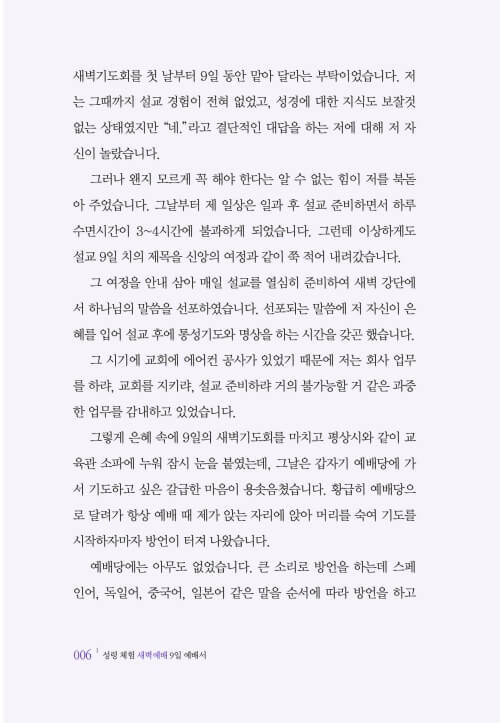 그렇게 은혜 속에 9일의 새벽기도회를 마치고 평상시와 같이 교육관 소파에 누워 잠시 눈을 붙였는데, 그날은 갑자기 예배당에 가서 기도하고 싶은 갈급한 마음이 용솟음쳤습니다. 황급히 예배당으로 달려가 예배 때마다 항상 제가 앉던 자리에 앉아 머리 숙여 기도하자마자 방언이 터져 나왔습니다.