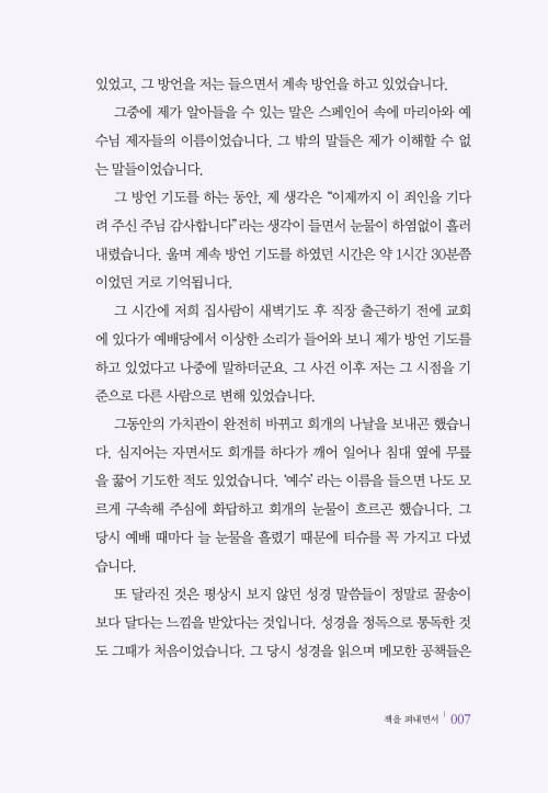그 방언 기도를 하는 동안 제 마음은 ‘이제까지 이 죄인을 기다려 주신 주님 감사합니다’라는 생각이 들면서 눈물이 하염없이 흘러내렸습니다. 울며 계속 방언 기도를 하였던 시간은 약 1시간 30분쯤이었던 것으로 기억됩니다.