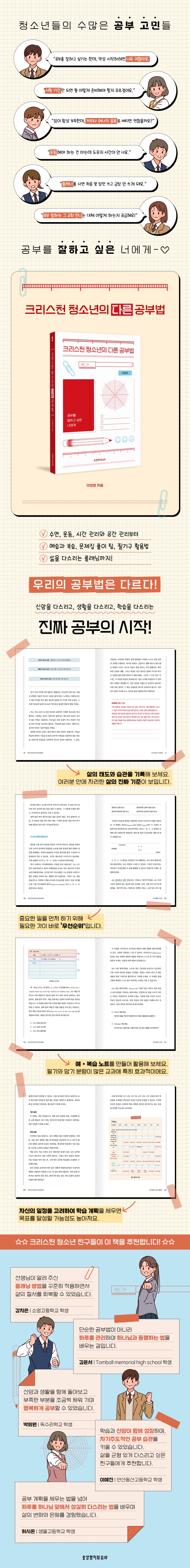 이 책은 성적과 입시 걱정 속에서도 하나님을 붙들며 공부하고 싶은 청소년, “열심히 공부해”라는 말 외에 무엇을 어떻게 도와야 할지 막막한 부모와 교사, 교회학교와 청소년부에서 공부라는 현실적인 고민을 신앙 안에서 이끌어 주고 싶은 목회자들에게 구체적이면서도 신앙적인 대안을 제시한다. 『크리스천 청소년의 다른 공부법』이 전하는 “우리의 공부법은 다르다!”는 선언은 단지 공부 방식의 차이를 넘어, 인생을 바라보는 관점과 하나님 나라를 향한 방향의 차이를 분명하게 드러낸다.
