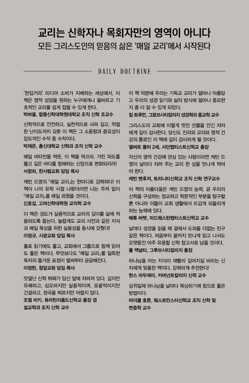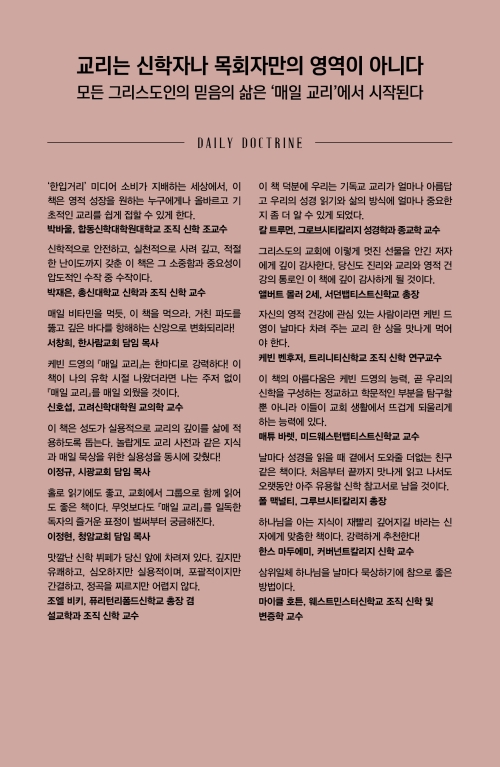 지금부터 30여 년 전 내가 영국으로 유학을 떠났을 때, 루이스 벌코프의 『기독교 교리 요약』을 달달 외우며 교리를 공부했던 기억이 선명하다. 케빈 드영의 이 책이 그때 나왔더라면 나는 주저 없이 『매일 교리』를 매일 외웠을 것이다. 오늘날 적지 않은 교인들이 성경은 교리와 상관없으며 교리는 교회 분열을 초래한다는 그릇된 신화 속에 살고 있다. 케빈 드영은 이 책에서 그런 신화를 산산조각 낸다. 도리어 교리는 성경 전체에 가득 차 있고, 교리 없는 교회와 신자는 하나님의 영광의 언덕 너머에 있는 더 높은 산을 보는 것으로 옮겨가지 못한다고 단언한다. 나는 그런 케빈 드영의 주장에 완전히 동의한다. 케빈 드영의 『매일 교리』는 한마디로 강력하다! 옆에 두고 매일 읽어야 할 책이다!