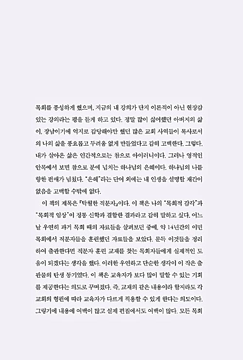이 책의 제목은 탁월한 직분자 이다. 이 책은 나의 “목회적 감각”과 “목회적 임상”이 정통 신학과 결합한 결과라고 감히 말하고 싶다. 어느 날 우연히 과거 목회 때의 자료들을 살펴보던 중에, 약 14년간의 이민목회에서 직분자들을 훈련했던 자료들을 보았다. 문득 이것들을 정리하여 출판한다면 직분자 훈련 교재를 찾는 목회자들에게 실제적인 도움이 되겠다는 생각을 했다. 이러한 우연하고 단순한 생각이 이 작은 출판물의 탄생 동기였다. 이 책은 교육자가 보다 많이 말할 수 있는 기회를 제공한다는 의도로 꾸며졌다.