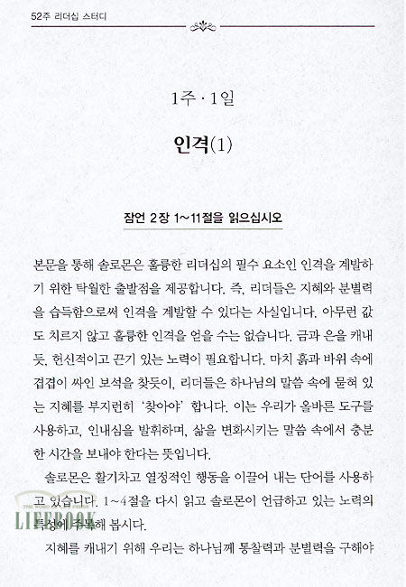 제1부 52주 리더십 스터디(15p~591p): 성경 속에서 52개의 리더십 주제를 설명하고 있다.