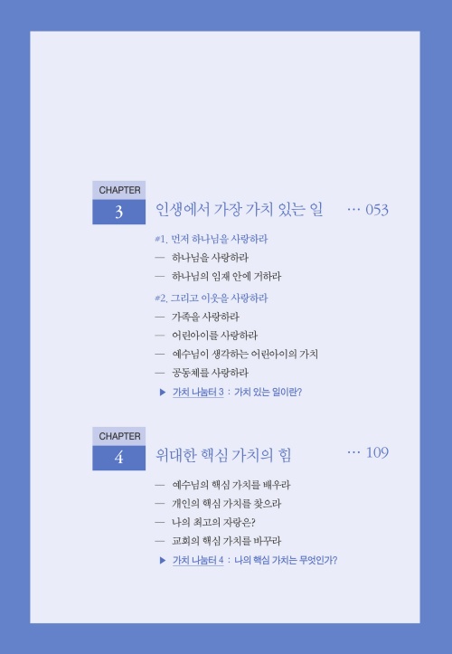 이 책의 내용은 랄프 네이버와 빌 벡햄, 짐 에글리 등의 NCD 강사에게서 좋은 영향을 받았다. 이 책은 혼자 읽어도 좋지만, 가능하면 10명씩 조를 만들어 같이 읽고 나누면 큰 도움이 될 것이다. 이 책은 총 6장으로 되어 있다. 각 장을 마칠 때마다 <가치 나눔터>라는 점검표가 있다. 이것을 서로 나누면 가치를 바꾸는 좋은 시간이 될 것이다.