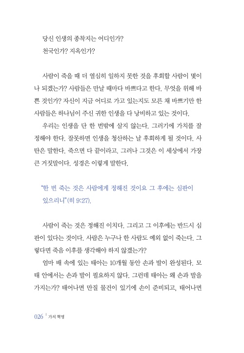 “우리는 가치 없는 일에 시간과 물질을 사용하는 것을 부끄러워해야 한다. 단 하루를 살아도 가치 있는 것에 투자하다가 주님께로 가야 한다. 세상은 가치 없는 것에 시간과 돈을 사용하라고 날마다 유혹하고 있다. 세상은 가치 없는 것에 가치가 있다고 속이고 있다. 그러나 성경은 ‘이 세상을 사랑하지 말라’고 하신다. 육신의 정욕, 안목의 정욕, 이생의 자랑은 다 가치 없는 것들이다. 성경이 헛되다고 말하는 것에 가치는 두는 자는 어리석은 사람이다. …당신의 가치는 무엇인가? 지금 내가 중요하다고 생각하는 가치가 어쩌면 너무나 어처구니없는 소모품과 같은 가짜 진주 목걸이인지도 모른다. 당신의 가치를 살펴보라. 당신의 인생을 다 팔아 세상의 부요와 쾌락과 권력의 신을 섬길 것인가? 예수님은 분명한 가치를 가지고 세 가지 유혹을 이기셨다. 당신은 세상의 유혹을 이길 수 있는 더 큰 가치를 가지고 있는가?”