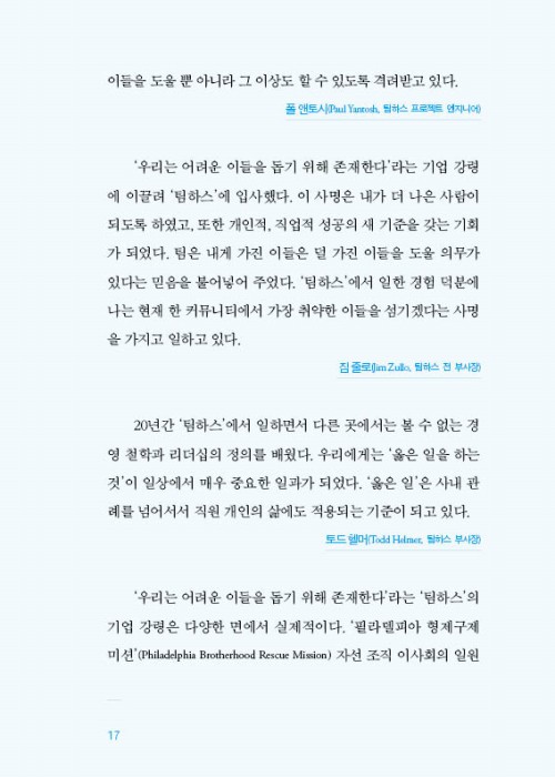 ‘팀하스’의 기업 강령은 다양한 면에서 실제적이다. 나는 한 자선 조직 이사회의 일원으로서, ‘팀하스’의 자원을 통해 이 자선 조직이 노숙자들을 구제하고 그 삶을 재건하는 모습을 똑똑히 목격했다.