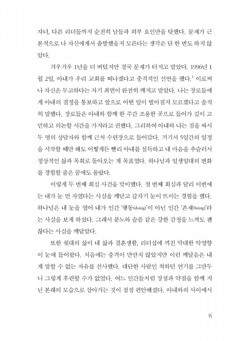 ‘사람들의 영혼이 달려 있는데, 어찌 내 가정의 안위만을 생각하겠는가’라며 주님을 향해 질주하던 리더에게 자기 최면이 깨질 때가 있다. 리더의 내적 붕괴, 가정의 파탄, 교회의 분열 등의 절체절명의 위기 앞에서 자신의 리더십을 되돌아볼 때가 있다. 바로 그때가 고통스럽지만 당신의 리더십을 하나님 앞에서 직면할 순간이다. 이 책은 저자가 뉴 라이프 펠로십 교회를 26년 간 목양하면서 정서적으로 건강한 리더가 되기 위한 여정을 담은 기록이다. 고통스럽지만 반드시 가야 할 길이다.