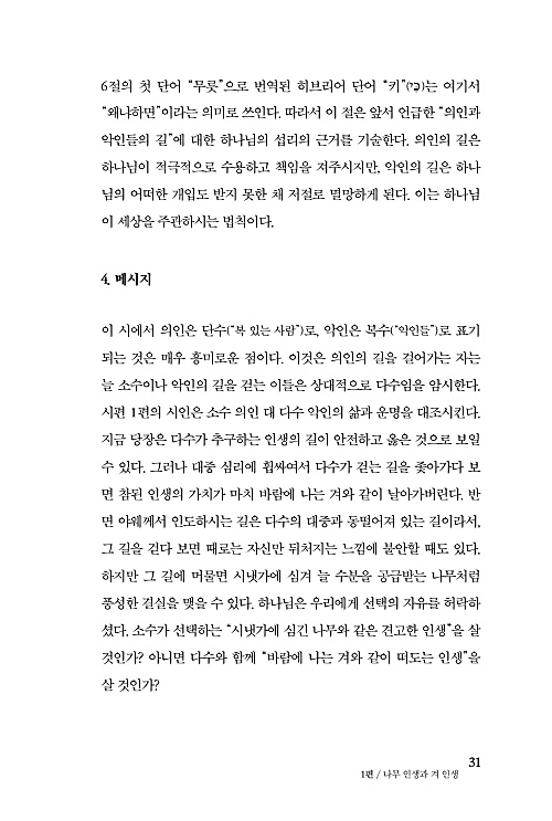 시편 1편의 시인은 소수 의인 대 다수 악인의 삶과 운명을 대조시킨다. 지금 당장은 다수가 추구하는 인생의 길이 안전하고 옳은 것으로 보일 수 있다. 그러나 대중 심리에 휩싸여서 다수가 걷는 길을 좇아가다 보면 참된 인생의 가치가 마치 바람에 나는 겨와 같이 날아가버린다. 반면 야웨께서 인도하시는 길은 다수의 대중과 동떨어져 있는 길이라서, 그 길을 걷다 보면 때로는 자신만 뒤처지는 느낌에 불안할 때도 있다. 하지만 그 길에 머물면 시냇가에 심겨 늘 수분을 공급받는 나무처럼 풍성한 결실을 맺을 수 있다. 하나님은 우리에게 선택의 자유를 허락하셨다. 소수가 선택하는 “시냇가에 심긴 나무와 같은 견고한 인생”을 살것인가? 아니면 다수와 함께 “바람에 나는 겨와 같이 떠도는 인생”을 살 것인가?
