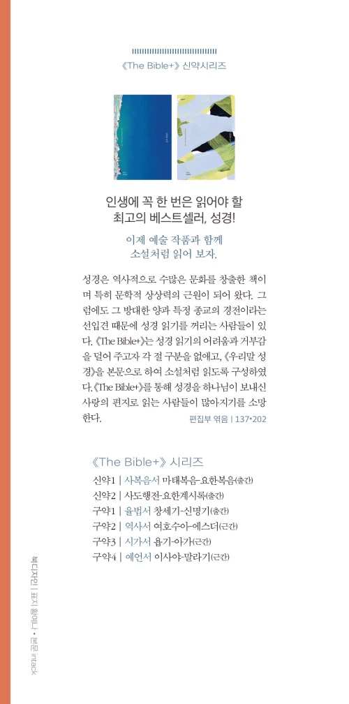 《The Bible+》는 성경읽기의 어려움과 거부감을 덜어주고자 각 절 구분을 없애 마치 소설을 읽는 것처럼 구성하였습니다. 사실 원래 성경에는 장절 구분이 없었고 후에 편리함을 위해 덧붙여진 것이므로 이러한 시도가 비판받을 일은 전혀 없습니다. 도리어 절을 구분함으로써 전체 문맥의 흐름에 따라 읽기를 방해하던 것으로부터 탈피하여 매우 중요한 유익을 얻을 수 있습니다. 훌륭한 예술 작품들을 함께 수록함으로써 성경을 예술적인 상상력과 함께 읽을 수 있게 한 것 또한 신선한 시도입니다. 후에 누군가 각 장별로 함께 들을 수 있는 음악도 소개하게 되는 날을 기대해 봅니다. 성경은 오감을 통해 읽을 수 있는 매우 다이내믹한 책이기 때문입니다. 《The Bible+》를 통해 성경을 하나님이 보내신 사랑의 편지로, 떨리는 사랑의 마음으로 읽는 사람들이 많아지기를 소망합니다.