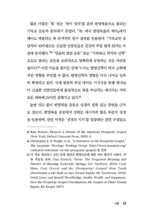 “우리는 번영복음의 파괴적인 가르침으로 교회가 위협받는 시대에 살고 있다. 번영복음은 현재 누리는 건강과 부와 힘을 강조한다. 한편 우리는 어떠한 물질적 복도 하나님이 주신 것으로 결코 인정하지 않는 다른 쪽 극단의 주장에 넘어갈 수도 있다. 성경의 용어인 복을 이제는 번영복음과 연결하므로 이 용어에 대해 탄식하는 사람들도 있다. 오즈번은 성경신학의 풍성한 식사를 제공함으로, 이런 극단적 주장에 빠지지 않게 우리를 보호한다. 그는 성경 전체에 나타난 복의 주제를 다루며, 하나님의 복이 관계적이고 영적이고 물질적이고 미래 지향적임을 탁월하게 주장한다. 이 작은 보화를 읽음으로써, 하나님이 자신의 백성에게 풍성하게 주시는 광대한 복에 대한 여러분의 이해가 넓혀질 것이다.”