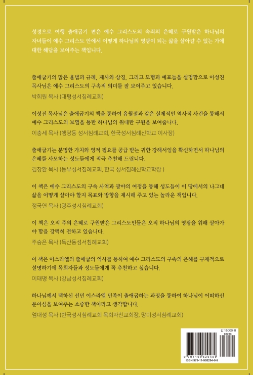 창세기가 죄의 결과가 무엇인지 보여준다면, 출애굽기는 유월절과 같은 실제적인 역사적 사건을 통해서 예수 그리스도의 보혈을 통한 하나님의 위대한 구원을 보여줍니다. 이성진 목사님의 ‘성경으로의 여행, 출애굽기’는 과거 이스라엘 백성이나 오늘을 살고 있는 성도들이 사탄과 세상을 상징하는 이집트에서 어떻게 구원받아 성화의 여정에 들어섰는지 하나님의 구원의 대서사시를 파노라마로 풀어 알기 쉽게 설명해 주고 있습니다. 천국을 향한 믿음의 순례의 대장정의 여정에 오른 모든 성도들에게 필요한 힘과 지혜를 공급해 주는 책이라고 확신하며 적극 추천해 드립니다.