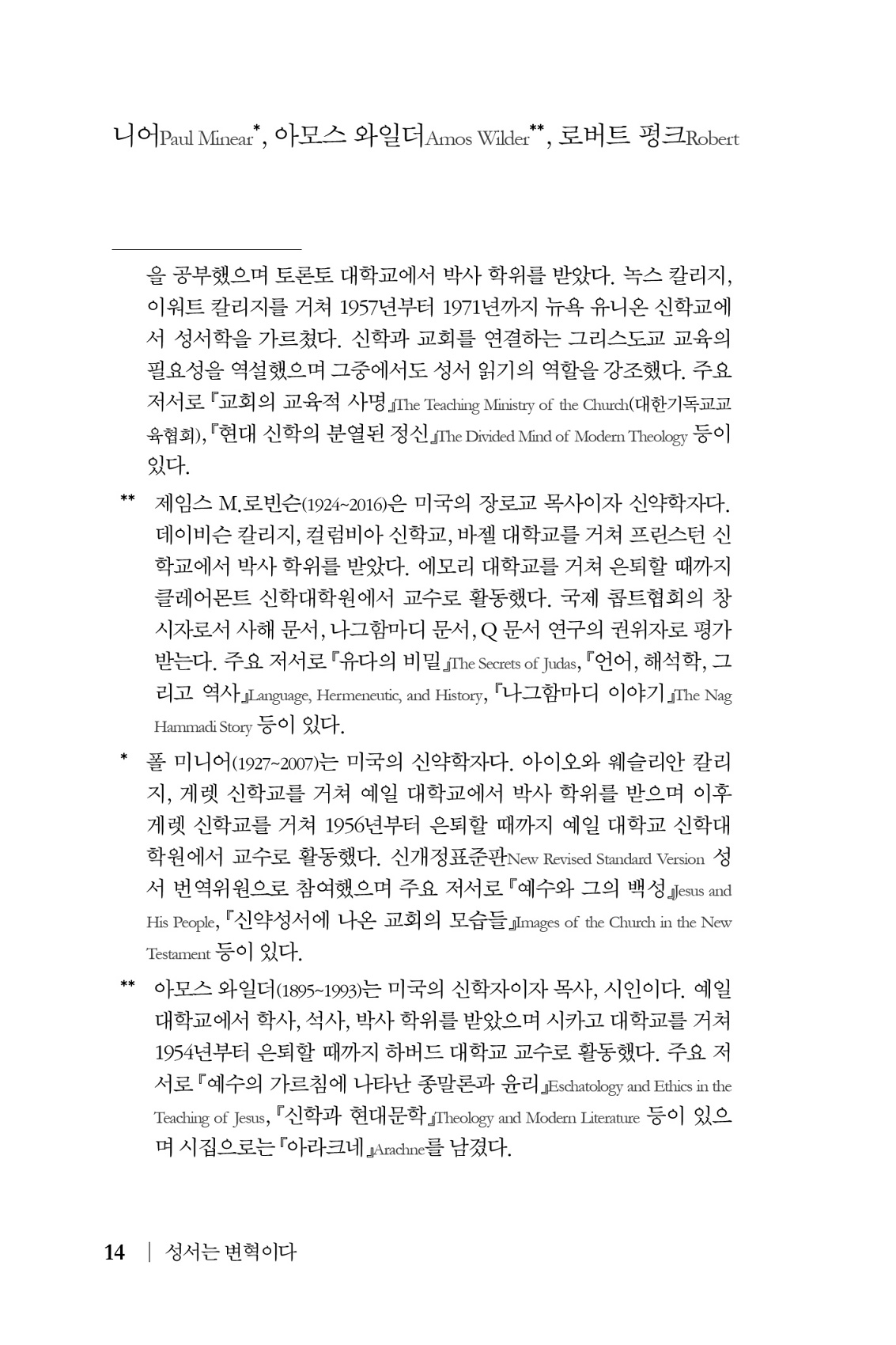 초판이 출간된 지 50년이 지났지만, 윙크가 제기한 문제와 통찰은 여전히 유효하다. 알베르트 슈바이처가 <예수 생애 연구>라는 걸출한 저작을 남기고, 홀연히 의사가 되어 아프리카로 떠났듯 윙크는 이후 자신이 제기한 문제의식을 따라 학계에서 주를 이루던 성서해석 방식을 버리고 독창적인 방식으로 성서, 인간, 세상을 해석하며 평화운동에 투신했다. 그는 성서가 진실로 인류와 세상을 변혁하는 텍스트임을 믿었던 것이다. 세상에 성서 각 권의 본문의 역사적 뜻을 분석한 책은 무수히 많다. 그 본문의 메시지를 다룬 책도 그만큼 많다. 하지만 그러한 가운데 성서가 우리 삶과 어떤 식으로 연결되어야 하는지, 오늘날 성서를 읽는 방식에 있어 학계와 교회는 왜 그리 차이가 나는지, 우리 삶에 맞갖게, 더 나아가 우리가 진실로 거듭나기 위해서는 성서와 어떻게 마주해야 하는지를 다룬 책은 드물다. 이 책은 그 소수의 책 중 하나며 그 소수의 책 중에서도 뜨거운 열정과 도전으로 가득 찬 책이다.