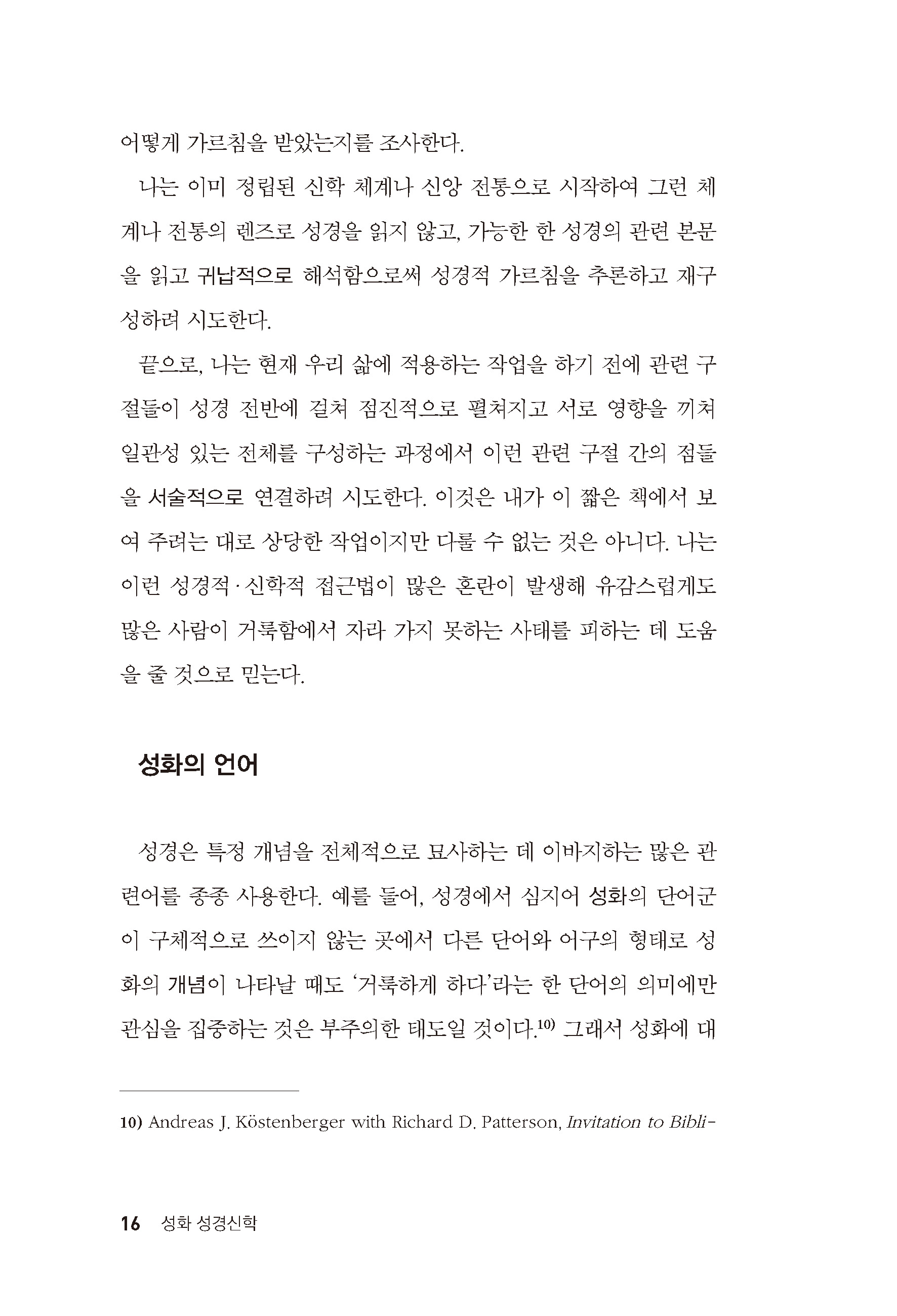 “짧지만 세심하며 설득력 있고 포괄적인 이 연구는 성화에 대한 견해가 상충하는 이유를 드러내고 성경 용어를 문맥에서 검토하며 인간을 위한 하나님의 목적이 성경에서 점진적으로 나타날 때 이 주제가 발전하는 방식을 추적하는 데 큰 성과를 올린다. 마니 쾨스텐베르거는 이 주제에 대한 성경적·신학적 접근법이 경건하게 살려는 사람에게 어떻게 필요한 동시에 힘을 주는지를 이 책에서 매우 명쾌하게 풀어낸다.”