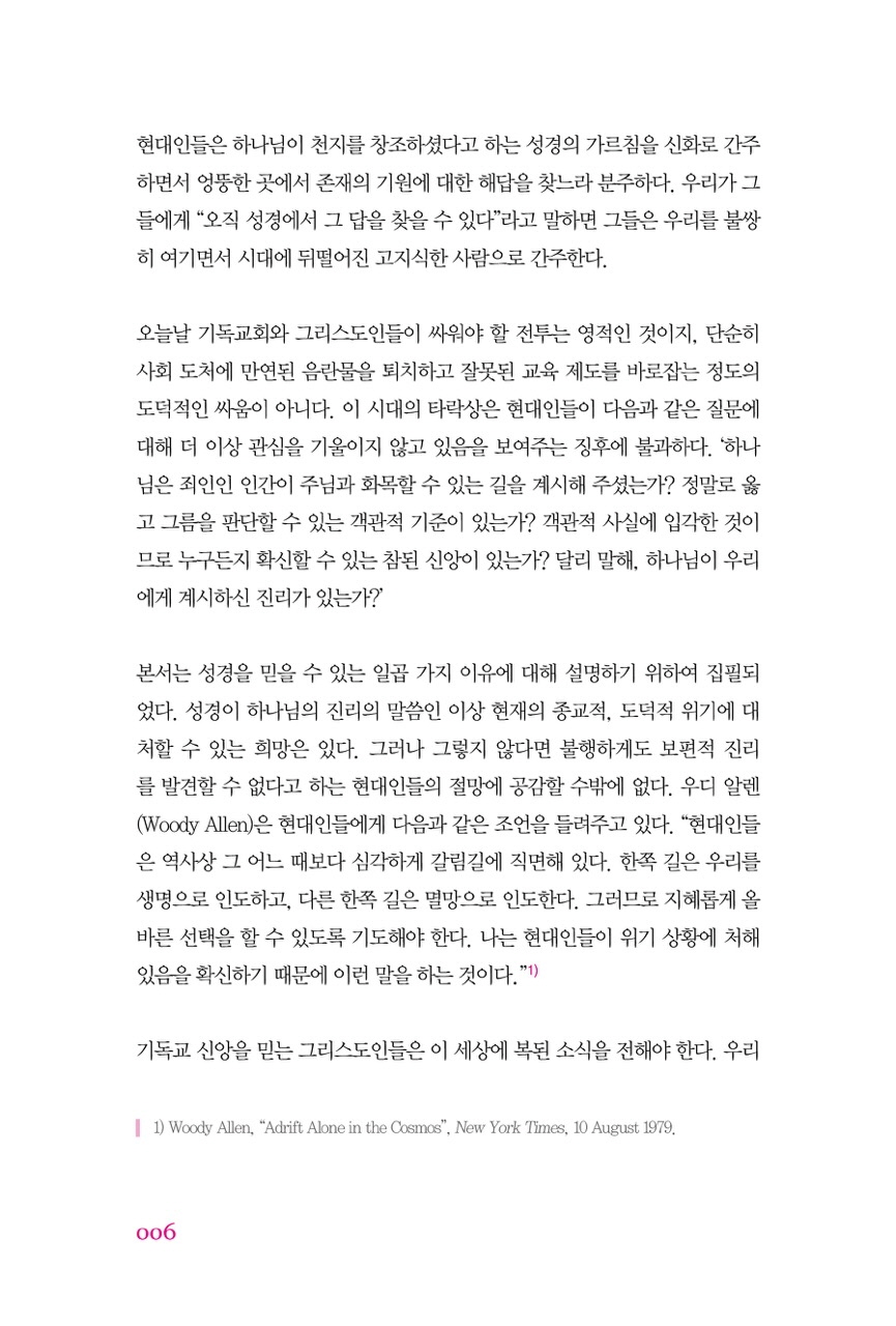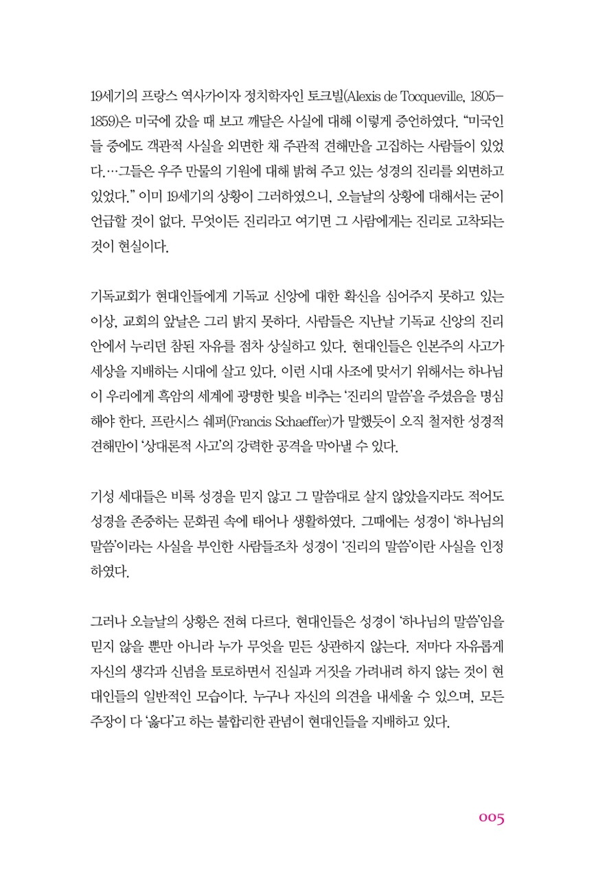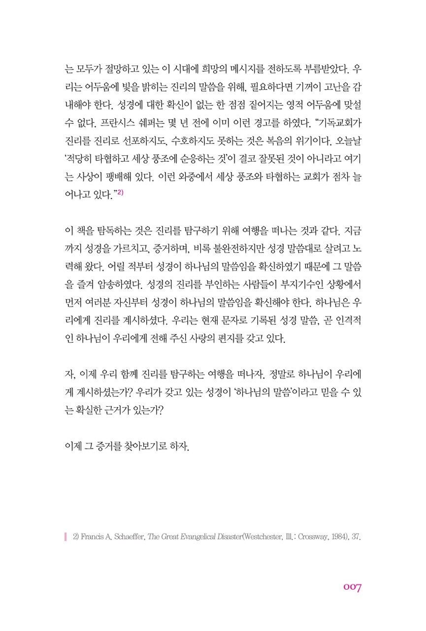 이 시대는 정말로 ‘주관적 믿음’이 판치고 있는 시대다. 본서는 성경을 믿을 수 있는 일곱 가지 이유에 대해 설명하기 위하여 집필되었다. 성경이 하나님의 진리의 말씀인 이상 현재의 종교적, 도덕적 위기에 대처할 수 있는 희망은 있다. 기독교 신앙을 믿는 그리스도인들은 이 세상에 복된 소식을 전해야 한다. 우리는 모두가 절망하고 있는 이 시대의 희망의 메시지를 전하도록 부름 받았다. 우리는 어두움 속에 빛을 밝히는 진리의 말씀을 위해, 필요하다면 기꺼이 고난을 감내해야 한다. 성경에 대한 확신이 없는 한 점점 짙어지는 영적 어두움에 맞설 수 없다.
