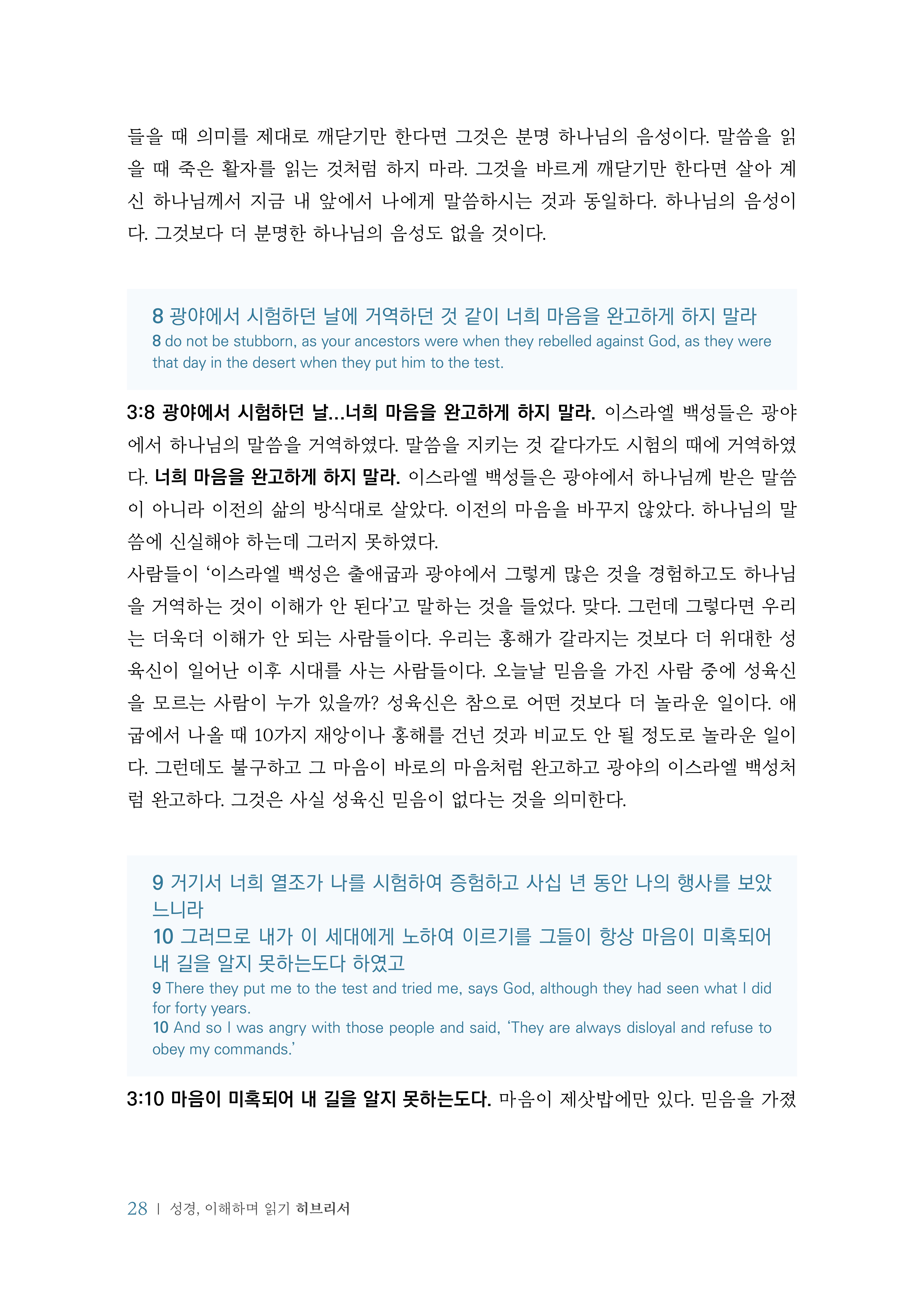 안식에 들어가기를 힘써야 한다고 말씀하였다. 그렇게 힘쓰기 위해 해야 하는 두 가지 일이 있다. 첫 번째는 말씀이다. 말씀을 읽고 순종하는 일에 힘써야 한다. 하나님의 말씀은 살아 있고. 하나님의 말씀을 대함에 있어 죽은 글자를 대하는 것처럼 하지 말아야 한다. 말씀은 하나님의 말씀이다. 살아 계신 하나님의 뜻을 알고, 마음을 느끼고, 힘을 경험해야 한다. 말씀을 읽고 묵상하고 순종하며 그 시간이 하나님을 만나는 순간들이 되어야 한다. 하나님을 자주 만나야 하듯이 말씀을 정기적으로 읽어야 한다. 활력이 있어. 말씀은 활력이 있다. 말씀은 읽고 끝나는 것이 아니다. 말씀을 읽으면 읽은 만큼 움직이게 된다. 하나님의 뜻과 마음을 알았는데 어찌 움직이지 않을 수 있겠는가? 아는 것만큼 행동하게 된다. 좌우에 날선 어떤 검보다도 예리하여 혼과 영과. 말씀은 날카로운 칼과 같다. 분별하게 한다. '혼과 영'은 구분하기가 어렵다. 혼과 영은 다른 2개가 아니라 하나의 두 측면이다. 혼은 정신적인 측면에 영은 조금 더 영적인 측면에 사용될 때가 많다. 그러나 두 가지를 정확히 구분할 수는 없다. 관절과 골수를 찔러 쪼개기까지 하며. '관절'은 뼈와 뼈를 연결하는 부분이고, '골수'는 뼈를 구성하고 있는 것이다. 이 둘을 나누는 것 또한 매우 어렵다. 말씀은 그렇게 구분하기 매우 어려운 부분까지도 구분하게 해 준다는 것을 상징적으로 설명한 것이다. 정신적인 측면과 물질적인 측면 어느 면으로도 구분이 어려운 것을 구분하게 해 준다는 것이다. 마음의 생각과 뜻을 판단하나니. 마음이 무엇을 생각하는지 알기 어렵다. 게다가 '뜻(헬, 엔노이아)’은 ‘의도'라 해석할 수 있는데 이러한 것을 구분하기는 더욱더 어렵다. 그러나 말씀은 그렇게 숨겨진 것에 대해서도 무엇이 옳고 무엇이 그른 것인지에 대한 '판단'을 할 수 있게 한다. 가치관과 선과 악이 혼동된 세상에서 우리는 말씀으로 선과 악을 판단하면서 살아야 한다.