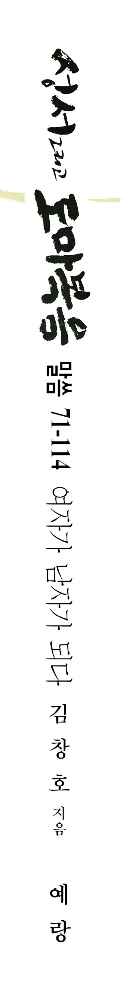 여자가 남자 되는 얘기는 도마복음의 가장 논쟁적 로기온이고 신비적 비의秘義다. 생물학적 여성을 남성으로 만든다는 얘기일까? 요한복음 16장은 생물학적 남성인 제자들을 해산하는 여인으로 비유하는 이야기가 나온다. 정신적으로는 남성이 아니라 여성이라는 얘기이니, 씨알을 내기보다는 씨알을 잉태하는 여성이라는 거다. 씨알의 잉태는 마음의 자궁에서 듣는 것을 통해 이뤄진다. 그것은 생물학적 남녀 모두에게 해당하는 말이다. ‘아들’을 낳게 되면, 비로소 ‘사람의 아들’ 씨알의 사람 남자가 된다는 얘기다. 씨알로고스의 불꽃을 내는 이가 있는가 하면, 짐승의 씨를 뿌려 대며 남자인 척하는 종교인들이 다수다. 들어야 할 여자라는 걸 잊고 있는 것이다.