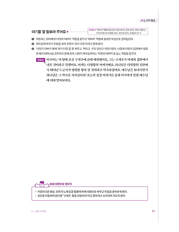 - 유치부 예배의 준비, 설교, 소그룹의 각 과정에서 유아의 흥미와 관심을 자극할 수 있는 다양한 아이디어를 소개하였다.