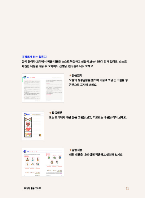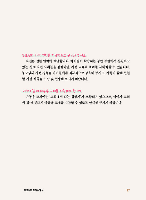 어릴 때 경험하는 말씀 교육의 중요성은 아무리 강조해도 지나치지 않습니다. 많은 분이 외우고 있는 대부분의 성경 말씀은 주일학교 때 외운 말씀들이 아닐까 싶습니다. 이 교재를 통해 동일한 영향력이 많은 분에게 일어나기를 바랍니다. 어릴 때부터 ‘하나님 사랑’을 깨닫고 ‘이웃 사랑’으로 나누는 방법을 배운 아이들이 어른으로 자랄 때까지 계속해서 그 사랑을 실천하여 열매 맺기를 바랍니다. 열매를 맺기 위해서는 씨앗이 심겨야 하는데, 이 교재가 아이들 가슴속에 심어지는 귀한 씨앗이 되기를 바랍니다.