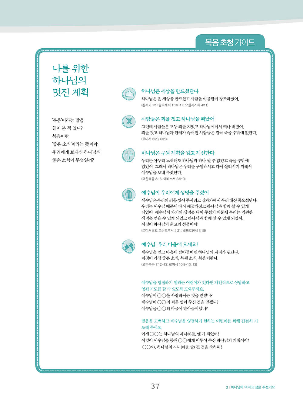 우리를 향한 하나님의 멈추지 않는 사랑, 아들을 내어 주신 아버지 하나님의 놀라운 구원 계획에 눈뜨게 하는 교재입니다. 성경을 꿰뚫는 변함없는 메시지, 예수 그리스도를 만날 수 있는 교재입니다. 유익한 활동과 흥미로운 반복 학습을 통해 기독교 핵심 주제를 접하고, 말씀을 가까이하며, 가족과 묵상을 나누도록 이끄는 방식에 기대가 큽니다. 다양한 소재의 영상과 그림 자료는 시청각 자료가 부족한 교육 현장에 큰 활력을 불어넣어 줄 것입니다. 교재 내용에 맞게 창작된 찬양은 곡조가 있는 산 기도를 체험하게 도와줄 것입니다. 무미건조한 습관적 예배, 아이들과 소통하지 못해 안타까워했던 부모와 교사, 다음 세대를 걱정하는 교회 지도자들에게 이 교재를 추천합니다.