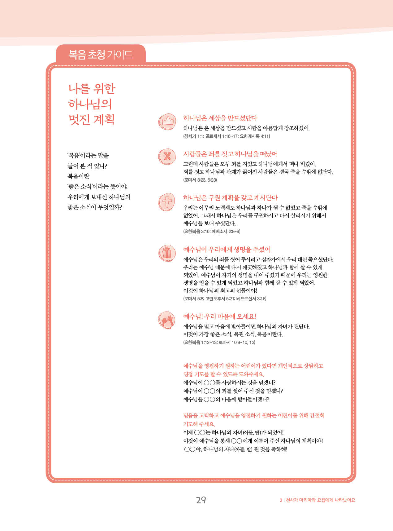 아이들을 양육할 때 오는 여러 가지 신학적, 신앙 교육의 궁금증을 해소할 수 있는 짧은 칼럼을 제공합니다. 매 단원의 암송 구절, 각 과에 필요한 활동 자료들을 담고 있으며, 이를 활용하여 소그룹 활동을 풍성하게 이끌어 갈 수 있습니다.