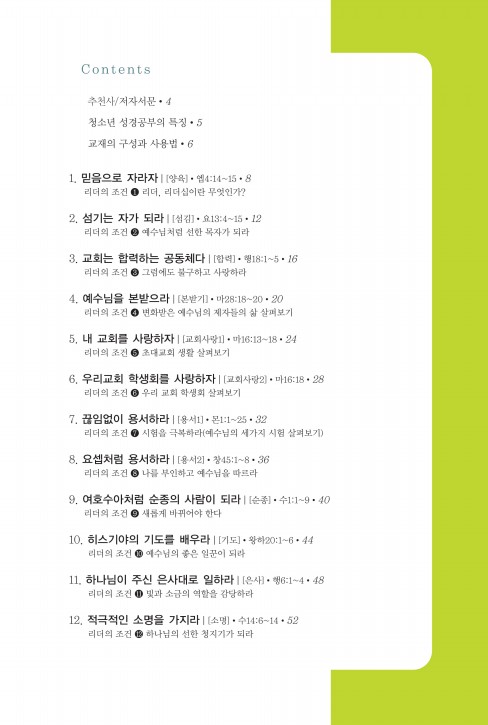 넷째, 이 교재는 리더로서 갖추어야 할 성품을 성경에서 찾아 정리하였다.