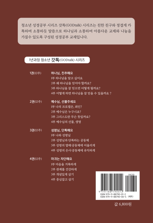 청소년 성경공부 시리즈 갓톡(GODtalk) 시리즈는 친한 친구와 정겹게 카톡하며 소통하듯 말씀으로 하나님과 소통하며 아름다운 교제와 나눔을 가질 수 있도록 구성된 청소년 성경공부 교재이다.
