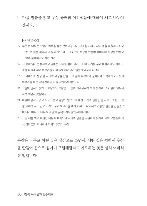 매주 관련 있는 감동적인 예화나 생각해 볼 내용이 수록되어 있다. 수록된 내용을 읽고 서로 자연스럽게 토론하고 대화를 나누는 시간이다.