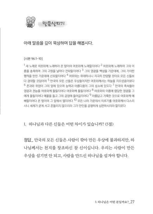 배운 말씀을 나누고 소통하며 생활에 적용하고 실천하는 과정이다. 질문을 잘 읽어 보고 적절한 답을 기록해 보자. 선생님과 학생들 간에 서로 답변하고 의견을 교환하면서 배운 말씀을 나누고 실천하도록 노력한다.